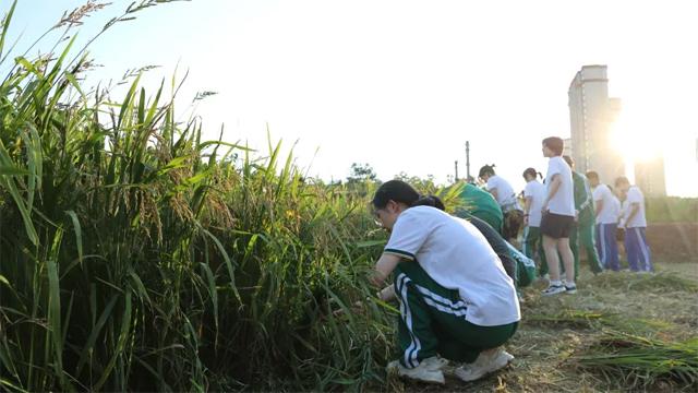 2024年7月,谭清芷和同学们一起在耕读农场割水稻。